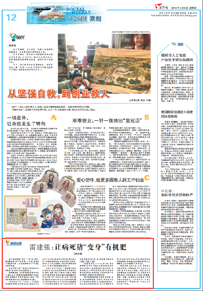 2019年9月5日,福建省委機關(guān)報《福建日報》發(fā)布題為“讓病死豬'變身'有機肥”的新聞報道,將我司雷建強總經(jīng)理主導(dǎo)研發(fā)病死豬無害化設(shè)備的創(chuàng)業(yè)故事作為雙創(chuàng)代表的先進事跡進行宣傳報道。具體報道內(nèi)容如下: