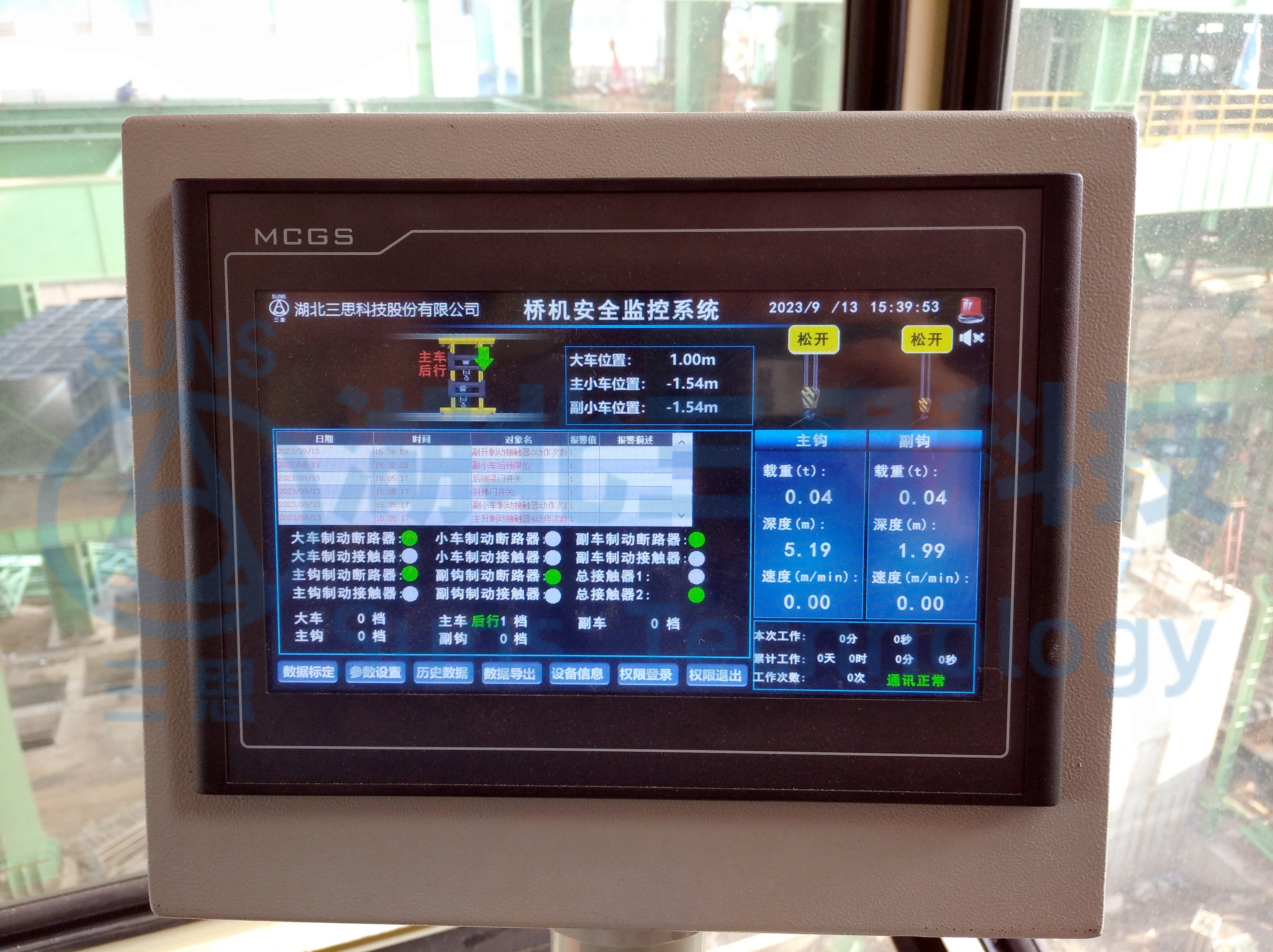 系統(tǒng)實(shí)時(shí)報(bào)警畫(huà)面及歷史報(bào)警畫(huà)面,記錄起重機(jī)運(yùn)行過(guò)程中的各種故障報(bào)警和設(shè)置報(bào)警,如:超載報(bào)警,門(mén)限位報(bào)警,主副鉤上限報(bào)警,天車行程報(bào)警,限位報(bào)警等,并且在故障發(fā)生時(shí)發(fā)出聲光報(bào)警,以及及時(shí)提醒駕駛員。